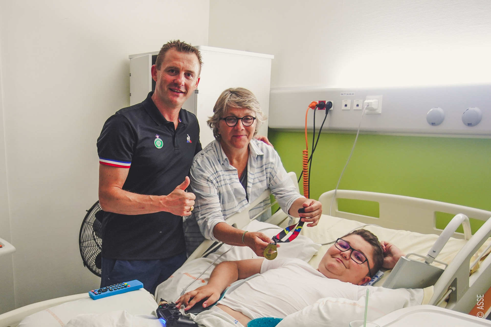 Il fête ses 14 ans ce vendredi, mais les fête depuis un lit d’hôpital. Dylan Barcet, joueur de l’équipe de foot fauteuil ASSE Cœur-Vert Aésio, a connu des meilleurs anniversaires. Mais la visite de Lionel Potillon lui a certainement apporté un peu de réconfort : d’autant plus que le Directeur d’ASSE Cœur-Vert n’est pas venu les mains vides ! Dylan a reçu sa médaille d’accession en Division 2, remise à son équipe le 23 juin dernier. Pascale Michalon, chef de projet communication d’Aésio, et Louis Granjon, responsable administratif de l’équipe de foot fauteuil de l’ASSE, étaient de la visite aux côtés de David Barcet, papa de Dylan et coach de l’équipe 2, évoluant en National 4.