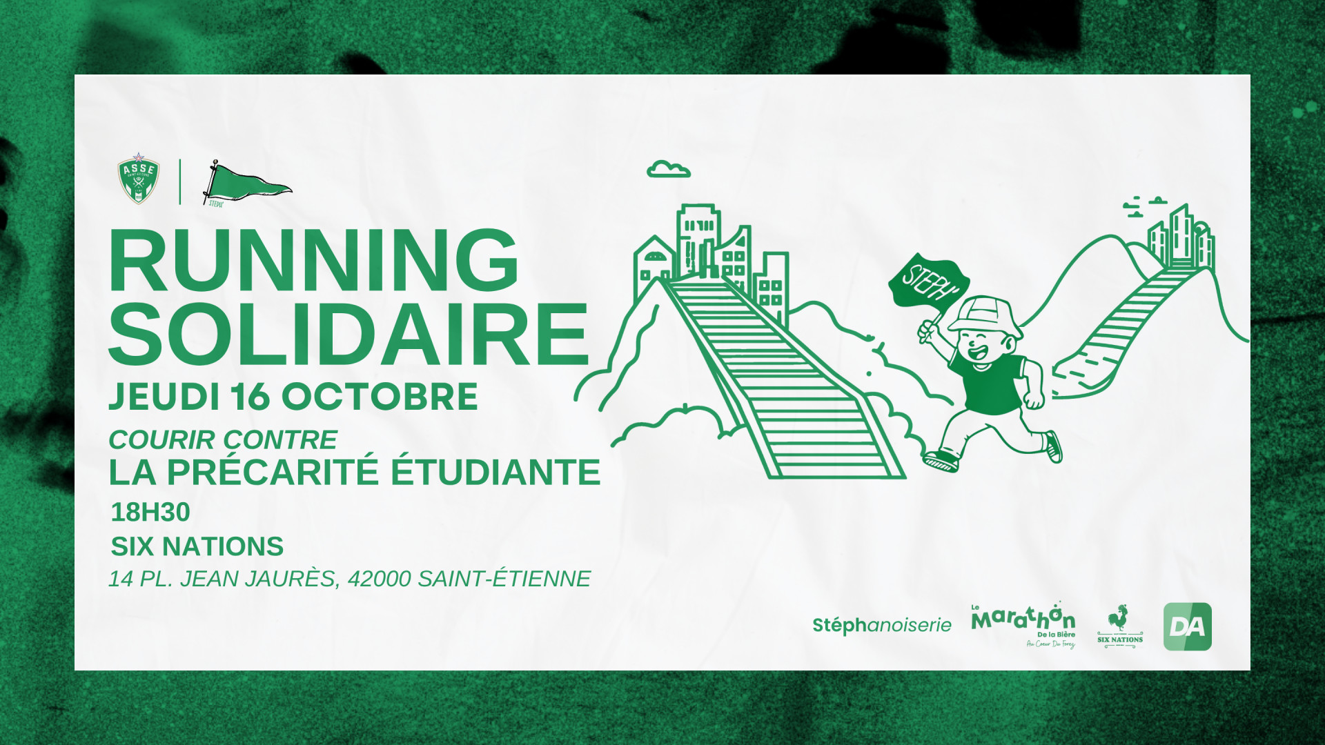 L’AS Saint-Étienne et son label culturel Steph’ organisent leur premier run social et solidaire le jeudi 16 octobre. À condition d’avoir déposé au moins une denrée alimentaire au stand Délivraide déployé pour l’occasion, venez courir en afterwork, dans la bonne humeur et entre Stéphanois, sur l’un des deux parcours de 5 et 8 kilomètres proposés, pour tous les niveaux, depuis la place Jean-Jaurès.